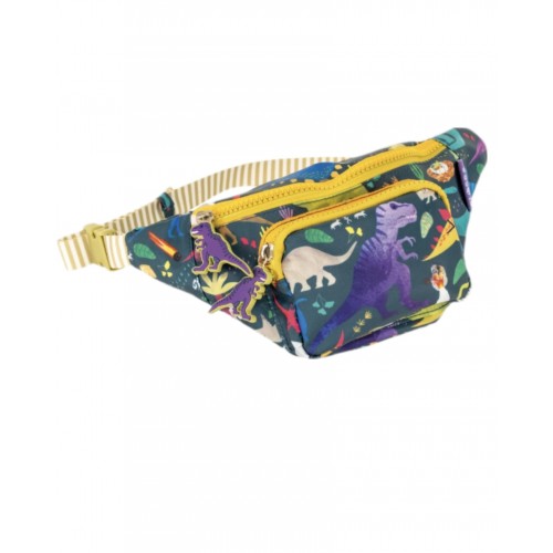 The bag is a traditional bum bag shape with one large and one smaller pocket, in dark blue water resistant fabric with lots of colourful dinosaurs on all pockets. The belt bit is stripey green and white webbing and is adjustable so it can grow with your dinosaur fan (or be passed on the younger ones) with a sturdy, easy release clip